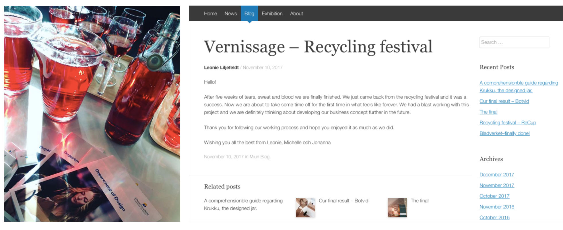 Reflective part (student assignment Recycling Festival): “Your group’s reflection on the design process and design methodology should be published weekly in text and images on the web. Also, you pitch your circular design process and concept at the recycling festival.”