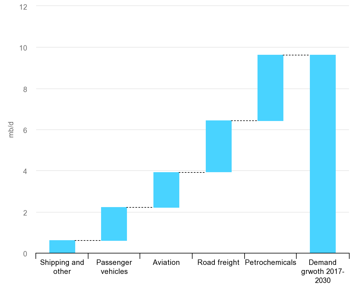 In short: plastics is a gargantuan market — and one of the reasons why the petrochemicals turn to different strategies to counter the threat of losing business. And turn to new strategies they must: For the global push away from combustion engine towards cleaner forms of transportation (electric, hydrogen etc.) will mean a significant drop in demand for fossil fuels coming from passenger vehicles and road freight. With a key market for their products going down, big oil producers and petrochemicals see plastics as a way to outgrow the decline of transportation markets.