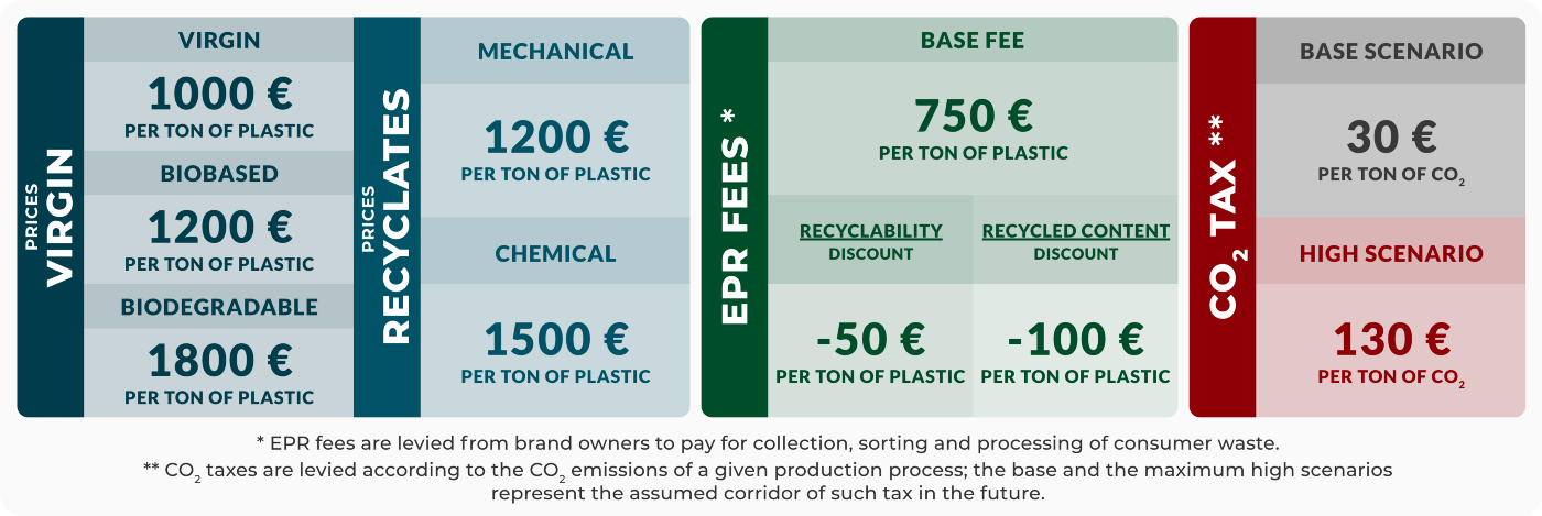 Prices and fees for procuring plastic and bringing it to market in 2030. Translated from Th. Müller-Kirschbaum, Th. Leopold (2019), Are we choking in plastic waste? Scenarios for sustainable and circular use of plastics; in: J. Gausemeier (ed.): ‘Vorausschau und Technologieplanung, 15. Symposium für Vorausschau und Technologieplanung, (Vol. 390, pp. 427–451), Paderborn, Heinz Nixdorf Institut.