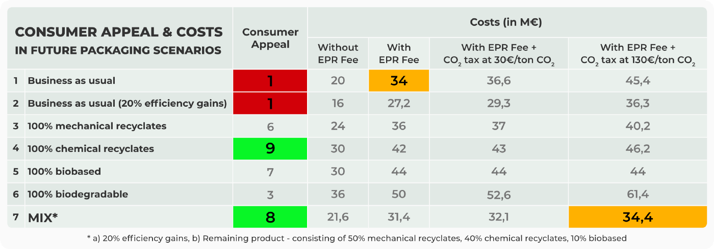 c) taking into account both consumer appeal and economic viability, the most attractive scenario is that of a packaging mix that uses 20% less material and consists of 90% recyclates and 10% bio-based virgin plastic. Even in the most expensive scenario where the CO2 tax is as high as 130€/ton of CO2 and an EPR fee is applied, such a packaging would cost about €34.4M. This is roughly the same amount it would cost a brand owner and their packager to do business as usual, if no CO2 tax whatsoever is applied (€34M). When applying the same CO2 tax, the packaging mix scenario even becomes significantly cheaper (€34.4M vs. €45.4M — see in figure above).